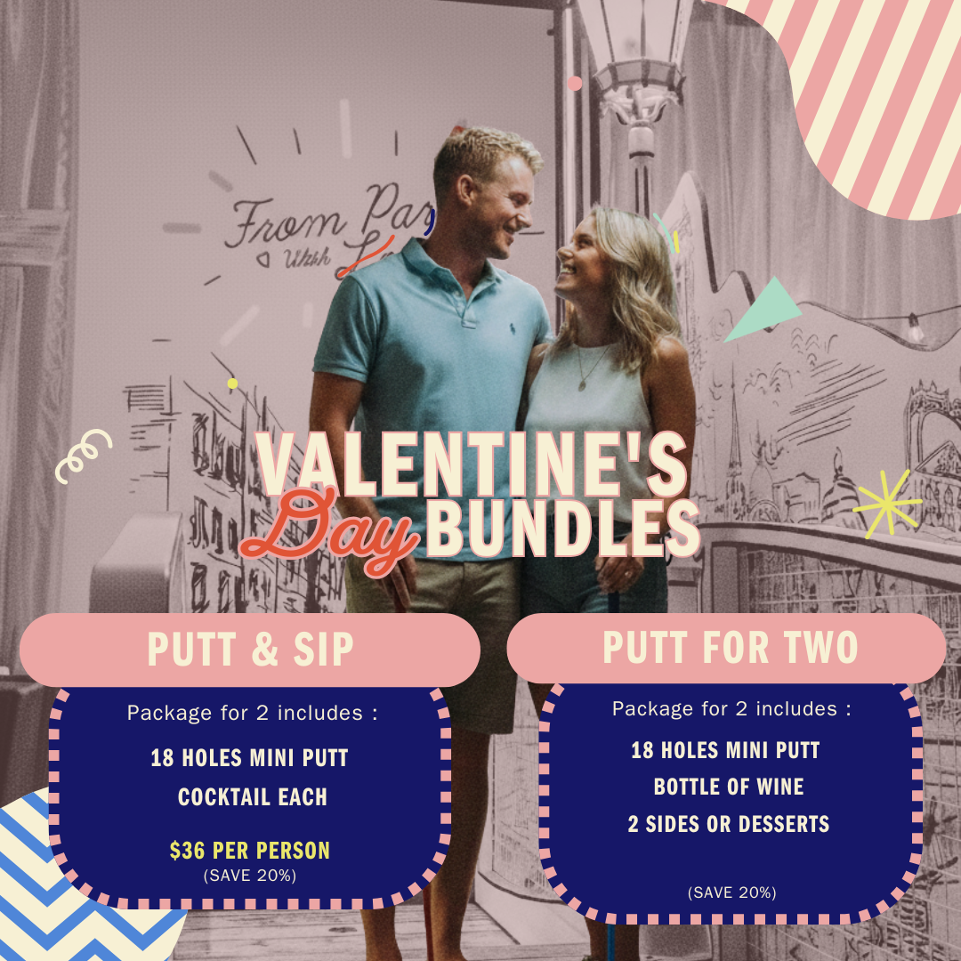 Tee up the perfect Valentine’s Day date with a fun-filled mini golf experience made for couples. Sink putts, sip cocktails or share a bottle of wine, and enjoy a full round of mini golf with playful competition for a hole-in-one Valentine’s night!